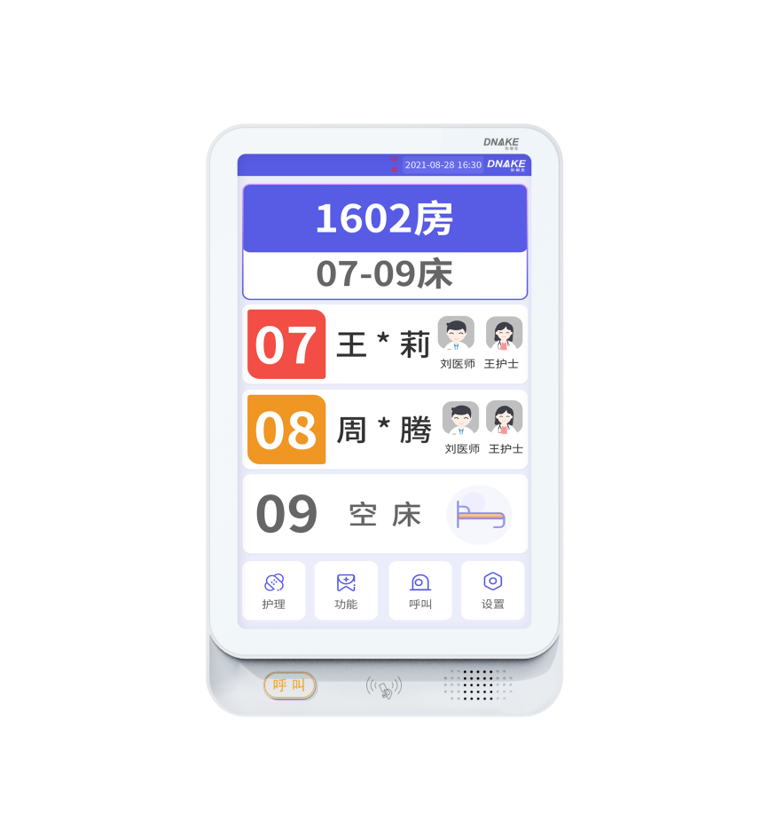 創(chuàng)新設(shè)置在病房門口的終端設(shè)備,主要用于顯示病房相關(guān)信息,內(nèi)置簡易醫(yī)護(hù)工作站,支持病房床位一覽、患者動態(tài)跟蹤、呼叫對講、增援求救等多種呼叫類型,信息齊全,及時響應(yīng)醫(yī)護(hù)需求,實(shí)現(xiàn)智能化醫(yī)護(hù)管理。