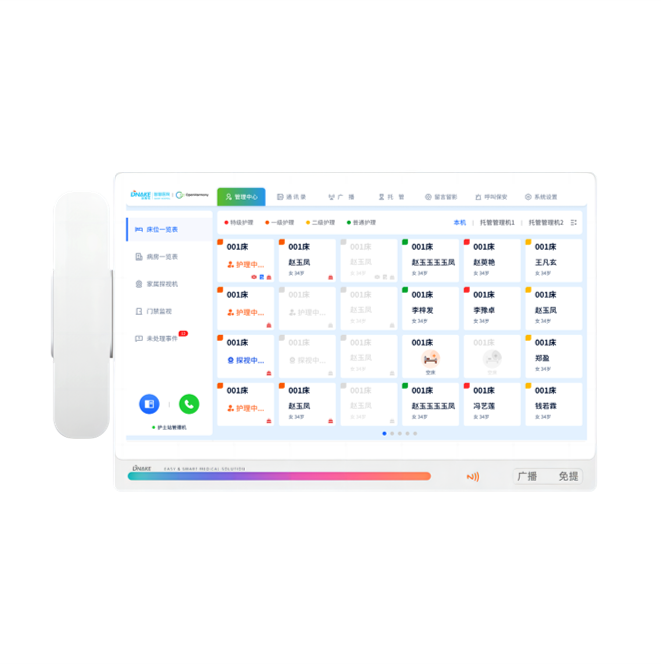 創(chuàng)新設(shè)置在護(hù)士站,可壁掛也可直接放在桌面上。主要接聽病區(qū)內(nèi)病床分機的呼叫以及患者信息查詢、廣播等基礎(chǔ)應(yīng)用功能,減輕醫(yī)護(hù)人員來回跑動的無效勞動和壓力,及時響應(yīng)患者需求,并做好醫(yī)護(hù)信息管理。軟件參數(shù):1)采用多點觸控電容顯示屏操作。每個觸摸按鈕可以顯示整個病區(qū)下的,所有病人的名字、性別、護(hù)理等級,點擊格子后,可顯示每張病床患者更具體的患者信息。2)基于TCP/IP網(wǎng)