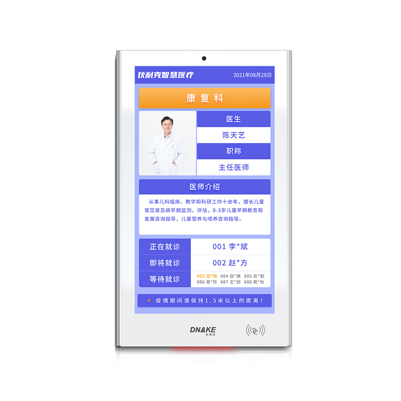 每個(gè)診室部署一臺(tái)液晶顯示終端,顯示出診專家(出診??啤⒔】敌痰龋┬畔?,診室叫號(hào)時(shí)全屏(或分屏)顯示需就診患者信息。